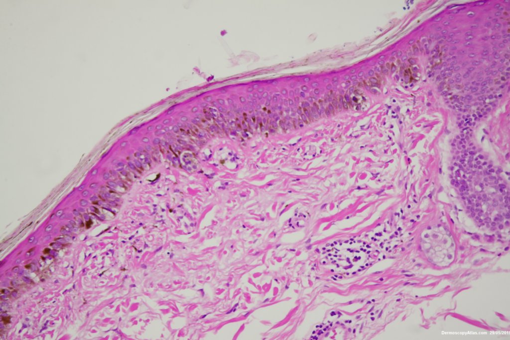 A shave biopsy removing the lesion was done. The histology showed a lentiginous proliferation of atypical basal melanocytes with a lymphocytic infiltrate and some melanin in melanophages causing the grey dots. There was also an in situ melanoma involving part of the seborrhoeic keratosis.