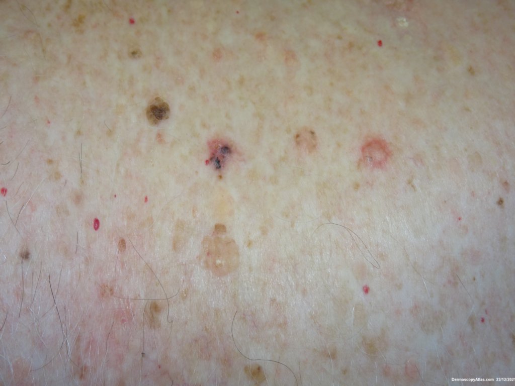 A pigmented BCC can show as here grey dots, lines peripheral radial meeting at a point, blue grey structures, ulceration, some brown dots and linear focussed branching vessels. Blue clods are also a feature of pigmented BCC but they are not well shown here.