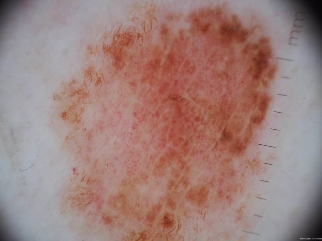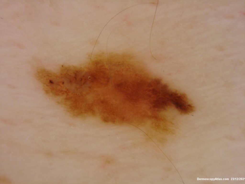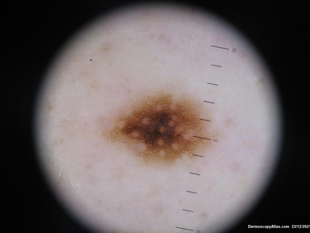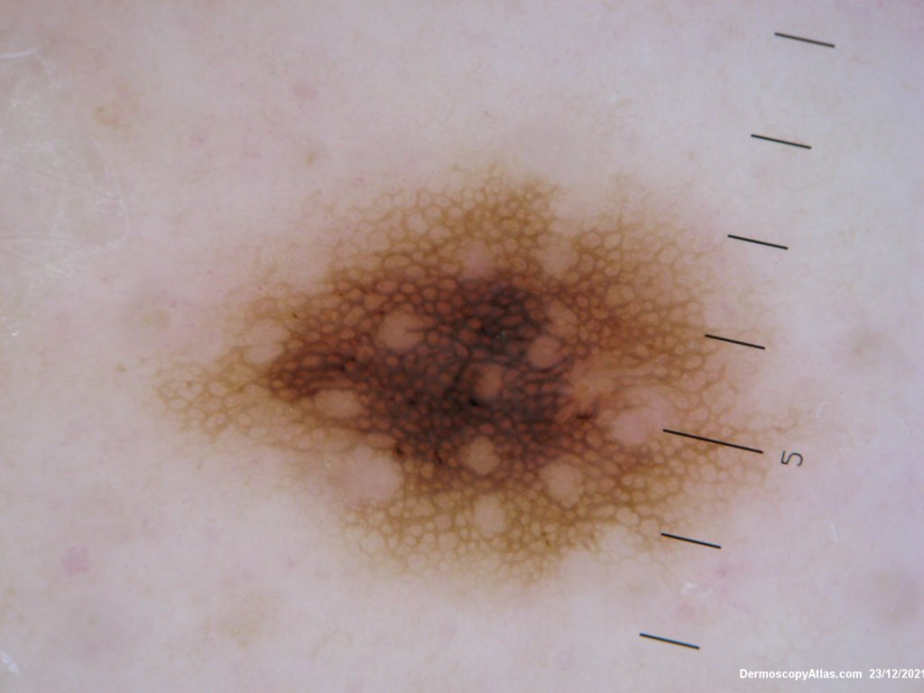 Clark (dysplastic) nevi usually show a lines reticular pattern which can be whispy peripheral or hyperpigmented centrally. If hyperpigmented at the periphery the pattern can mimic a melanoma in situ. Peripheral clods can also be seen in combination with a reticular pattern when the lesions are early and growing. The central area of a Clark nevus can also be hyperpigmented structureless.