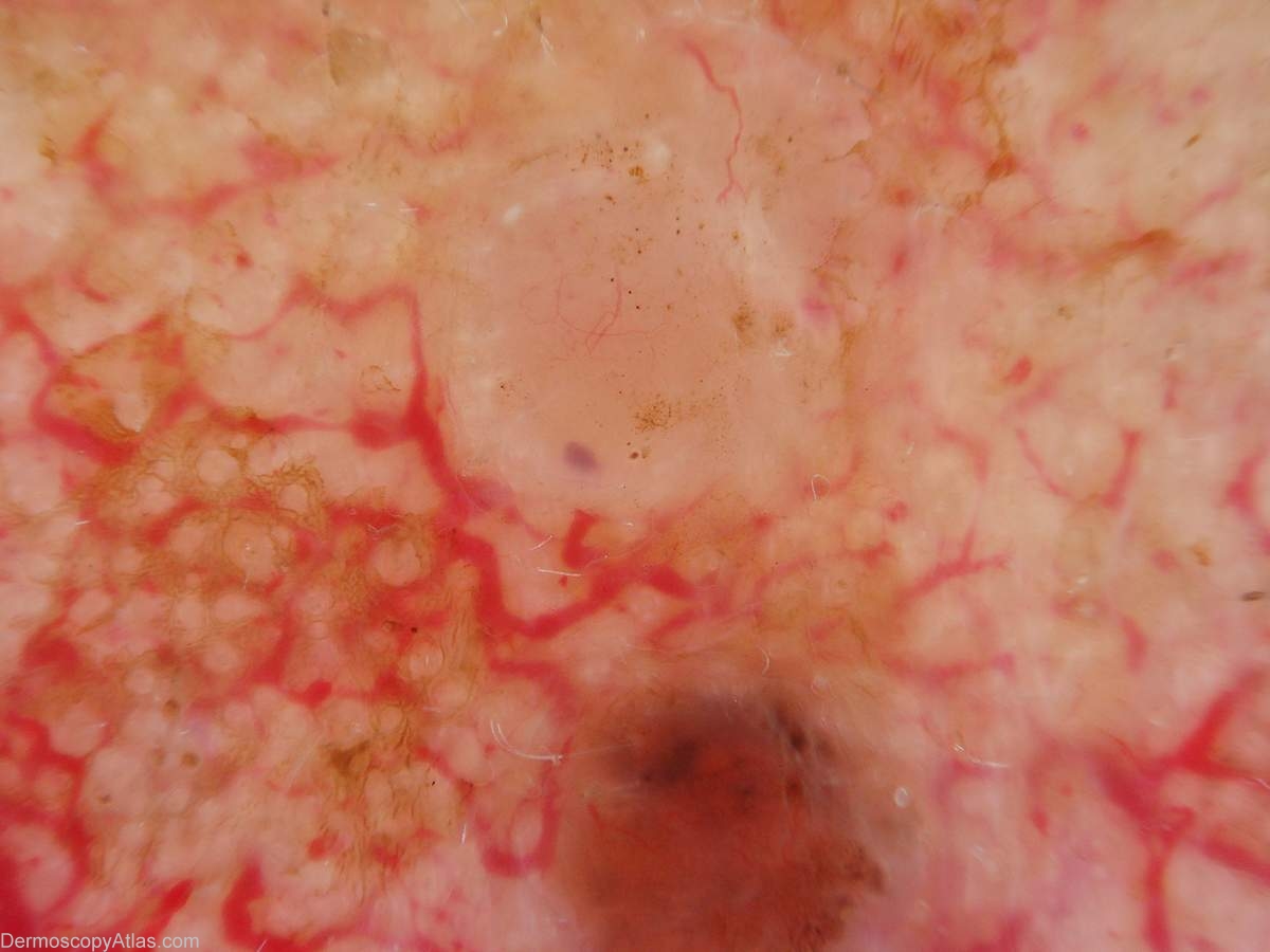 Description: Two lesions on the cheek. One is pigmented while the other shows the more typical features of a BCC.