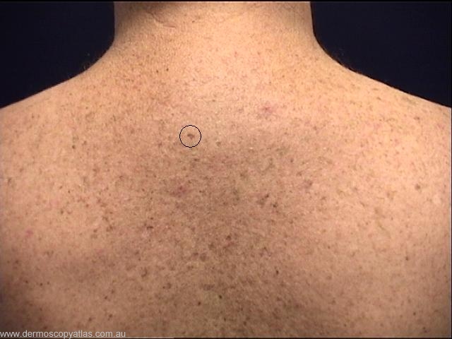 This 34 year old male presented for a routine skin check, and this more prominant "freckle" was noted on his upper back. The image on the left is mole max and on the right heine.
