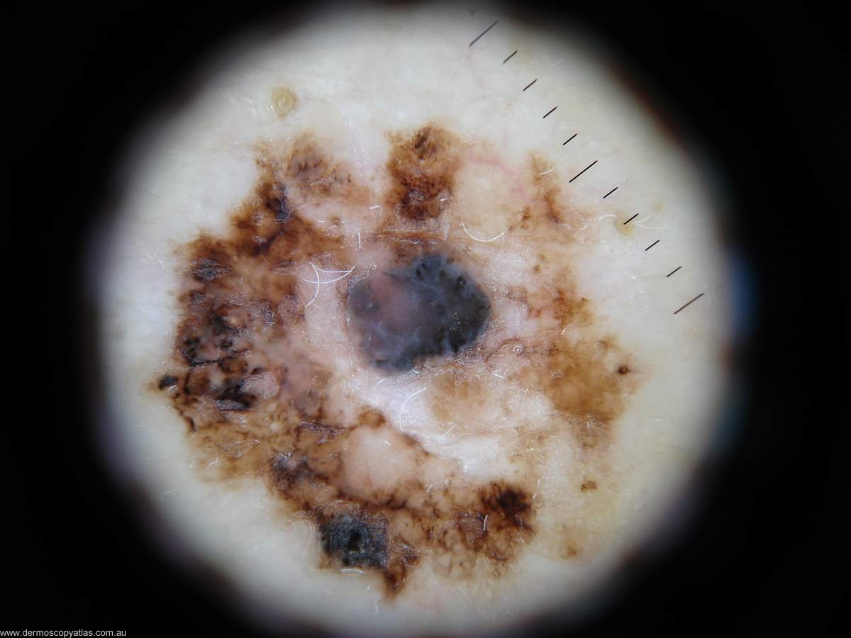 To make a diagnosis of melanoma it should have neither of the negative features and at least one of the positive features. The good thing about this method is there is no grading involved. You either have a feature or you don’t. The symmetry of pigment pattern includes both structures and colour along any axis through the centre of the lesion. It does not matter if it is an asymmetrical shape. It is the symmetry of the pigmentation pattern that is important. This is the feature of a benign pigmented lesion. As far as single colours go white is not scored. The presence of a single colour virtually excludes a diagnosis of melanoma. The colour of melanoma varies with the level of the presence of melanin in the epidermis and in the dermis. In the superficial epidermis it is black going through brown to the deep epidermis when it is blue. Melanomas generally have more than one colour.