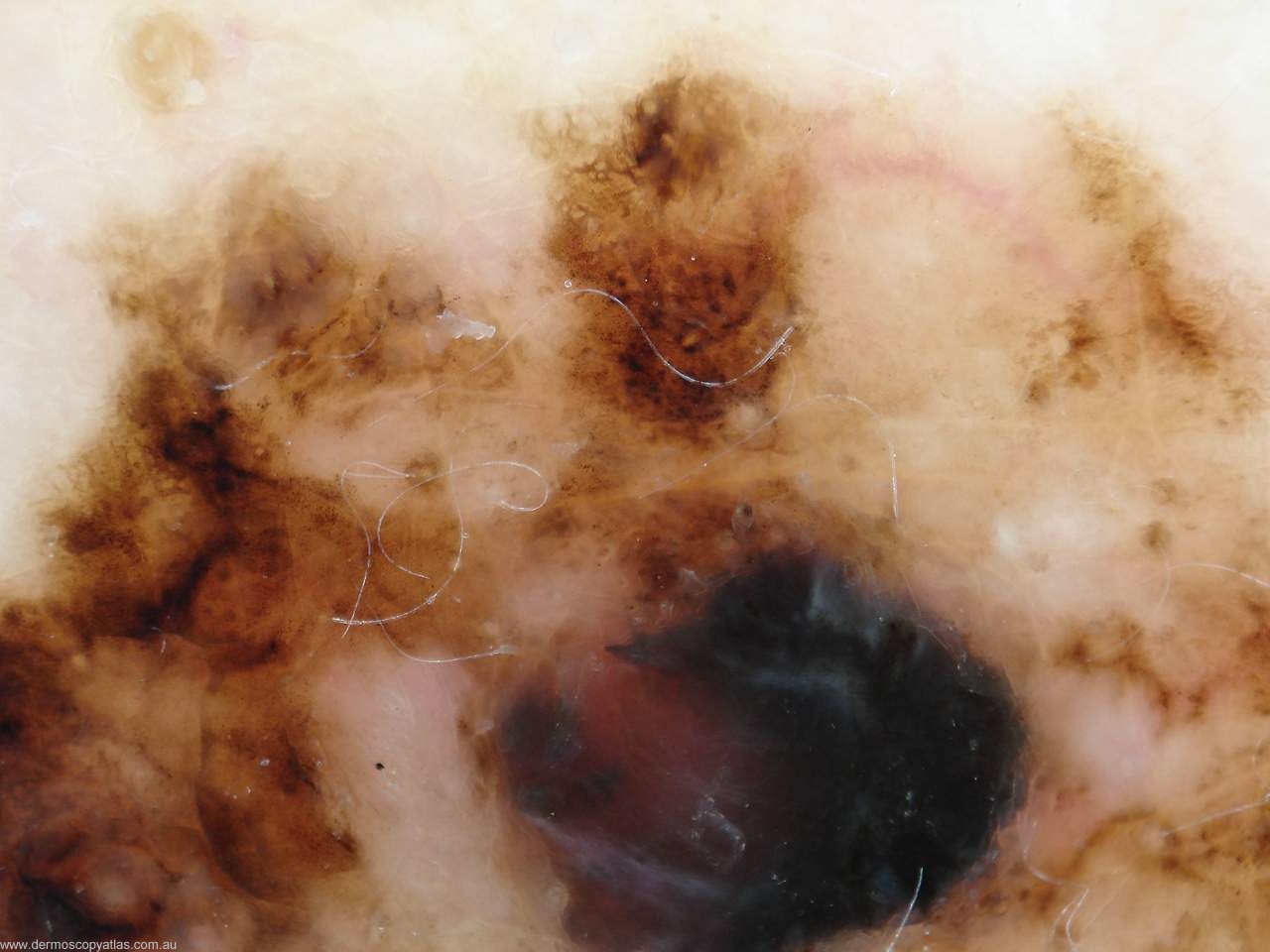 Lastly multiple brown dots are seen focally in melanomas. They are found in 30% of melanomas and have a specificity of 97%.