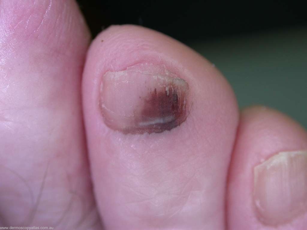 Question: What do you think the diagnosis is ? Consider Haematoma, Melanoma, Naevus, Onychomycosis and Cheap nail polish.
