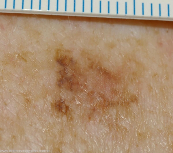 Question: What is your provisional diagnosis? (Consider Superficial BCC, Dysplastic junctional nevus,Irritated solar lentigo,Melanoma in situ and Pigmented actinic keratosis.)