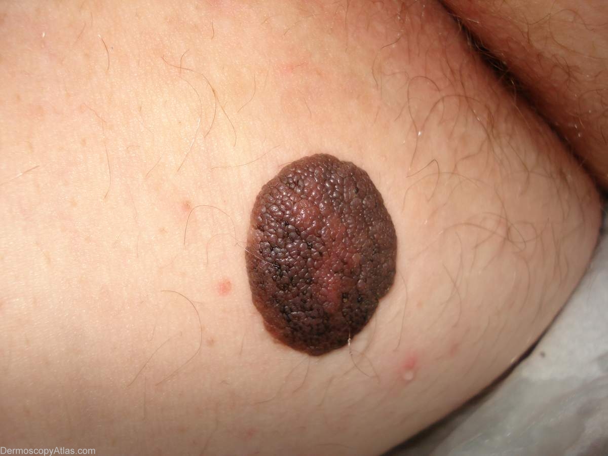 History: This is an example of a congenital nevus ( a nevus present from birth or shortly thereafter).It has a very papillated surface and excess hairs growing from it.