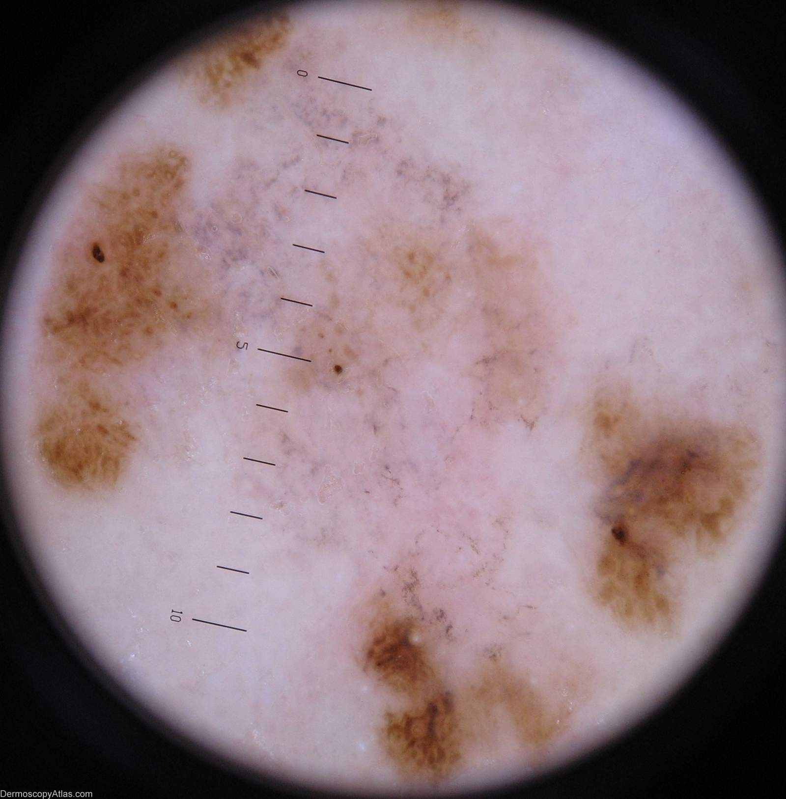 Case courtesy of Dr Greg Canning This poorly demarcated lesion is approx 5 cm in diameter and has resided on the left proximal postero medial calf of it's 72 year old owner for as long as she can remember. On reflection however she thinks it may have enlarged somewhat over the years. She has been repeatedly reassured about it by the doctors who have treated her numerous non melanoma skincancers.