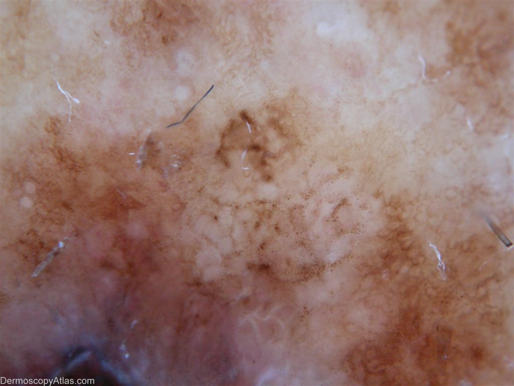 Global-Non specific pattern and a multi-component appearance (areas of network, dots and globules, and diffuse hyperpigmented and hypopigmented areas).