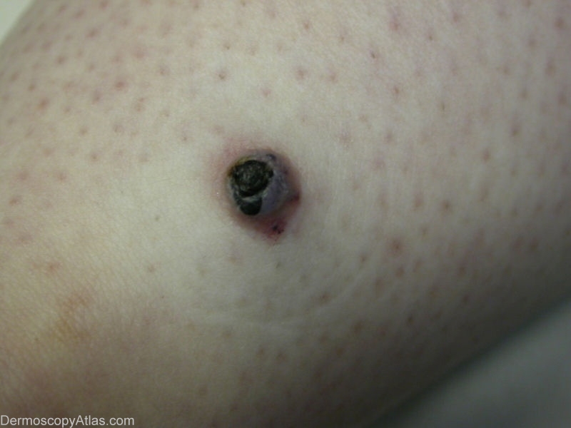 Dermoscopic description: Dark lacunae, whitish veil, peripheral erythema, red lacunae and hemorrhagic crusts.
