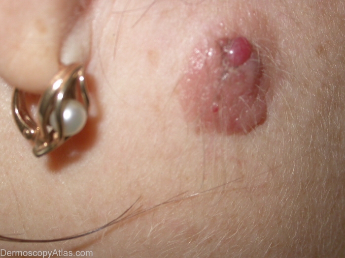 Dermoscopic description: Comma vessels, dotted vessels in the periphery and some corkscrew vessels occurring in a pink lesion.
