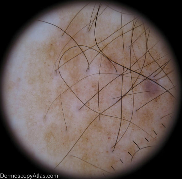 Dermoscopic pattern: Diffuse brown pigmentation with some network fragments and few remnant globules.It also shows hypertrichosis.