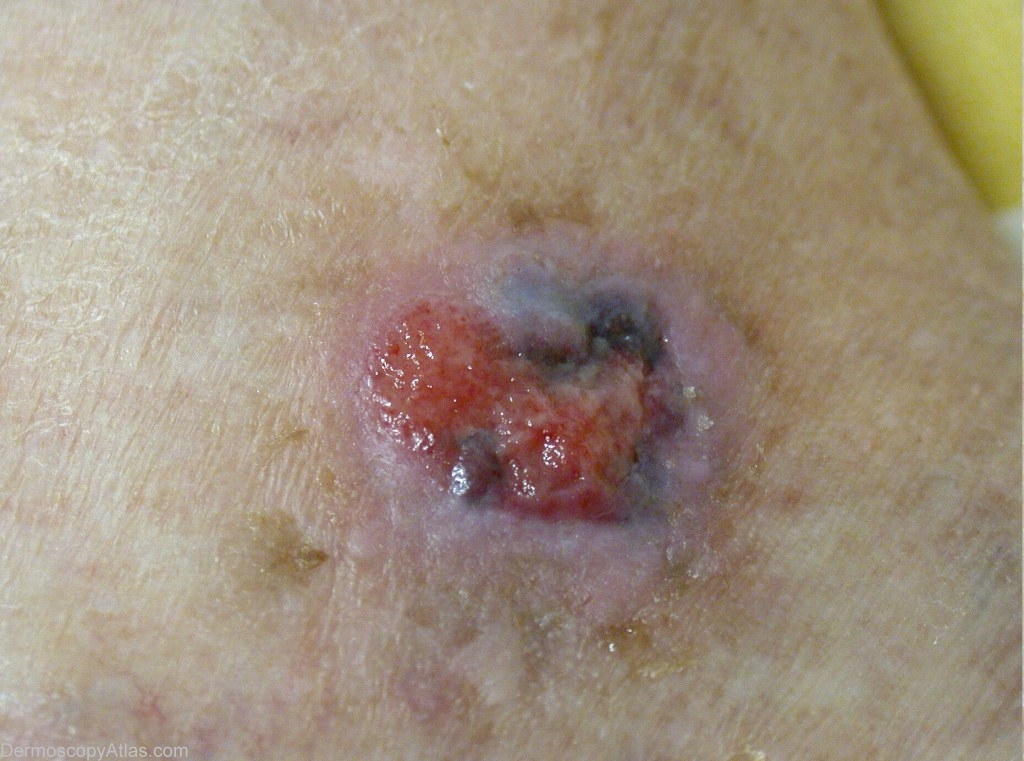 History: This lady came for a dark blue ulcerated lesion of a leg. Biopsy showed a pigmented basal-cell carcinoma. It is a twin case to case 189.
