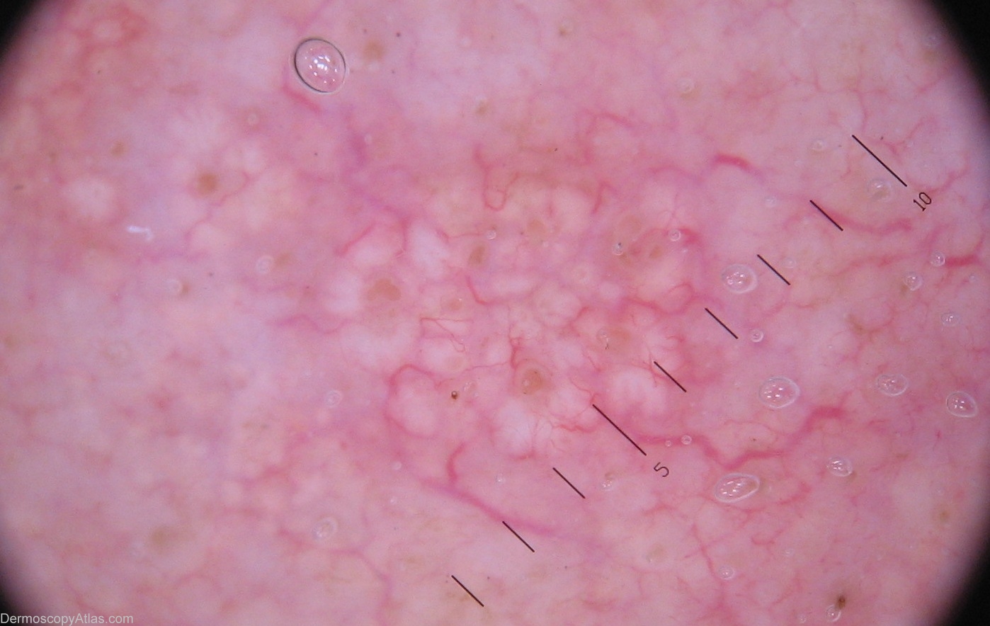 History: This patient has had multiple BCCs excised and also has multiple areas such as this on his face. Cystic BCC can sometimes be difficult to differentiate from sebaceous hyperplasia, but this lesion shows the typical white cystic areas and crown or wreath like vessels seen in the latter condition.