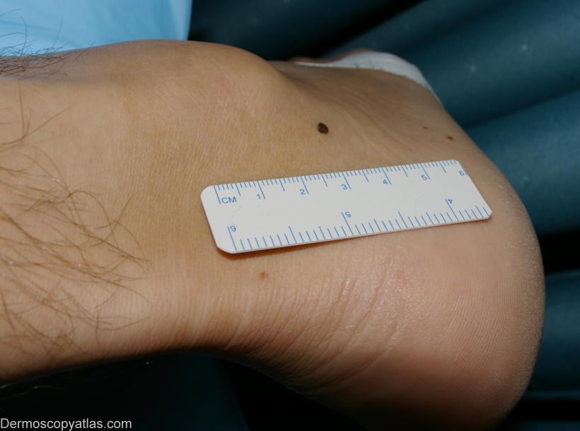 Middle aged keen surfer .He has skin phototype II and naevi with similar dermoscopic features on his trunk and limbs.This naevus( 3mm) was excised at his request.