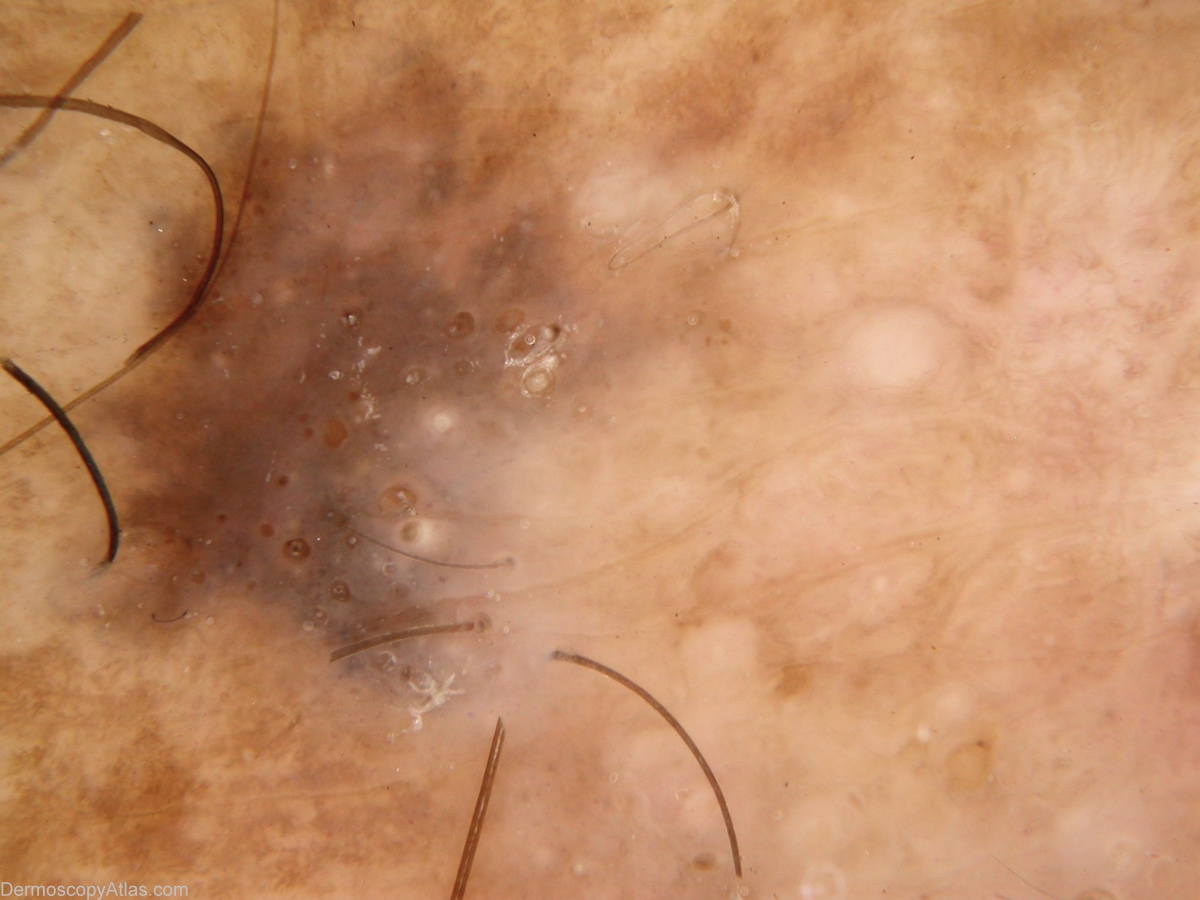 Description: Extensive regression (white area) raises suspicion clinically. Comedo-like openings best seen in detail view define this as seborrheoic keratosis
