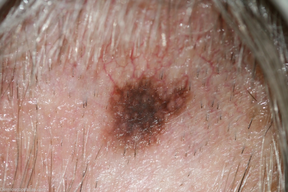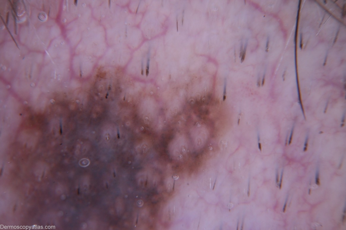 Description: Circles gray and brown sum to the diagnosis of melanoma in situ. This lesion exhibits broadened pseudonetwork with blue-grey being a prominent colour. Although seborrhoeic keratosis was a differential diagnosis there are no clues to this ( such as milia-like cysts or keratin crypts)