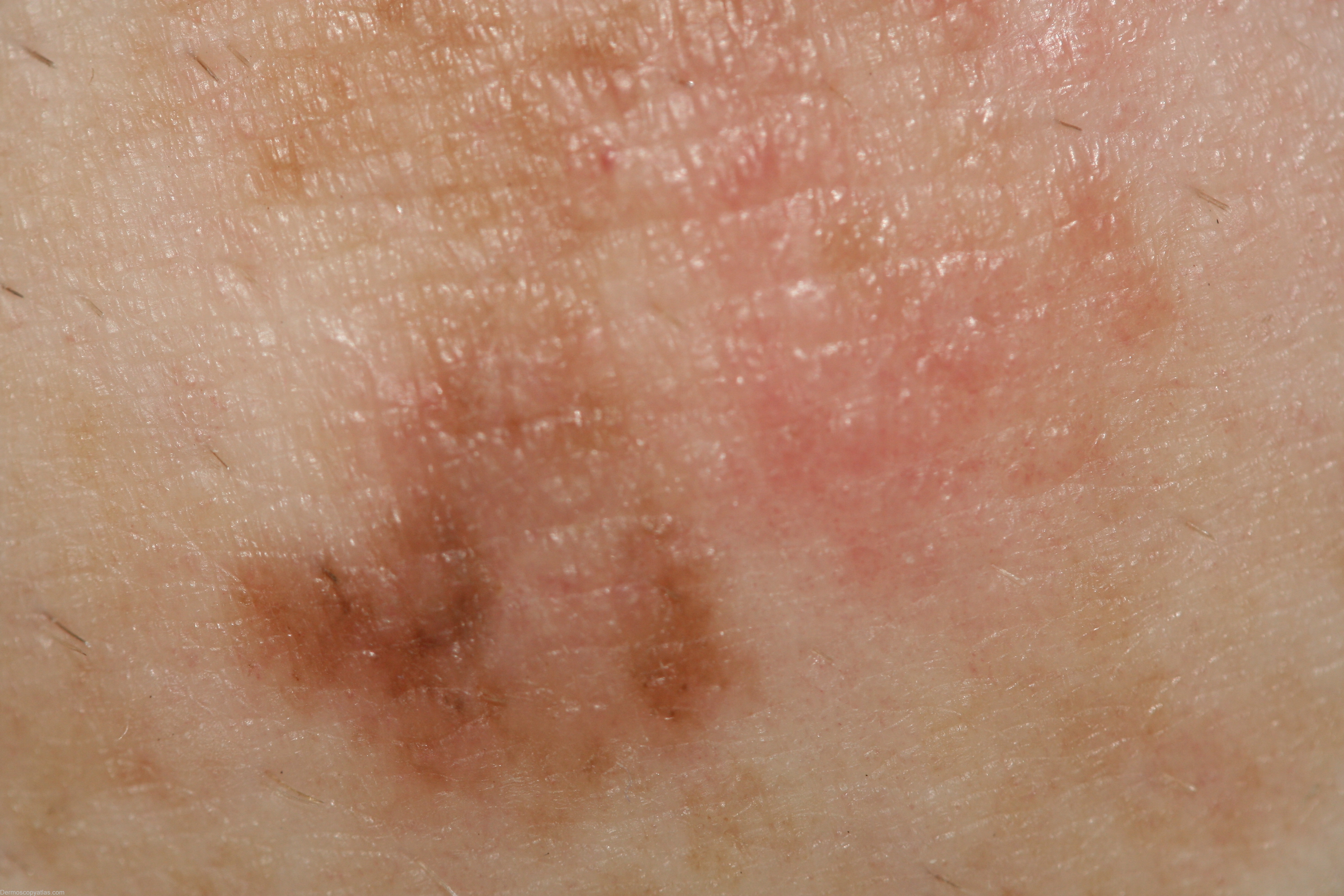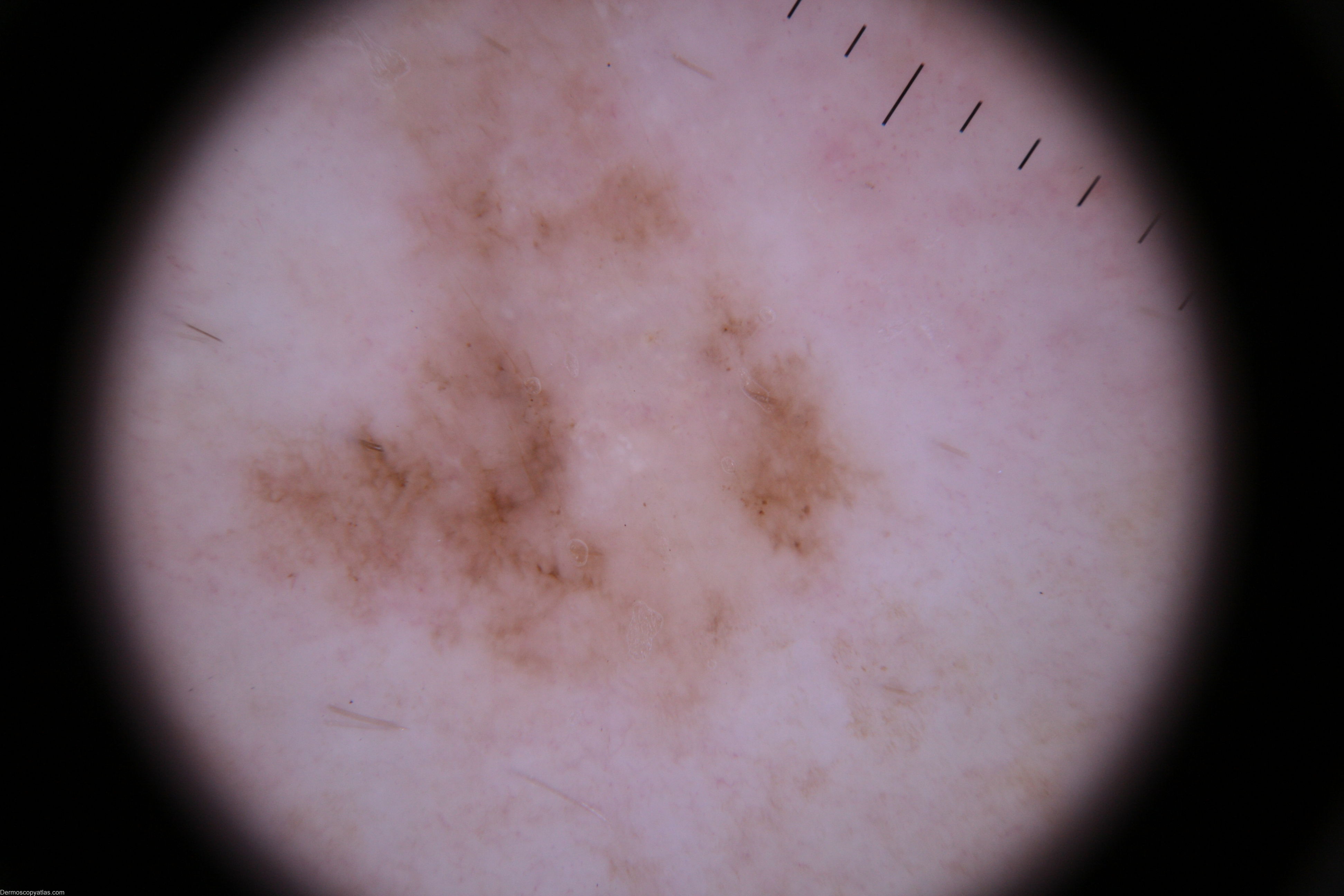 Description: > 1 pattern: lines reticular, structureless zone, >1 color clue to melanoma: structureless white zone, eccentric