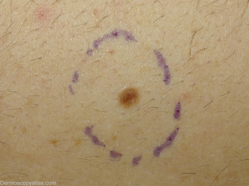 Description: Dermoscopy- Multiple brown dots and negative pigment network.