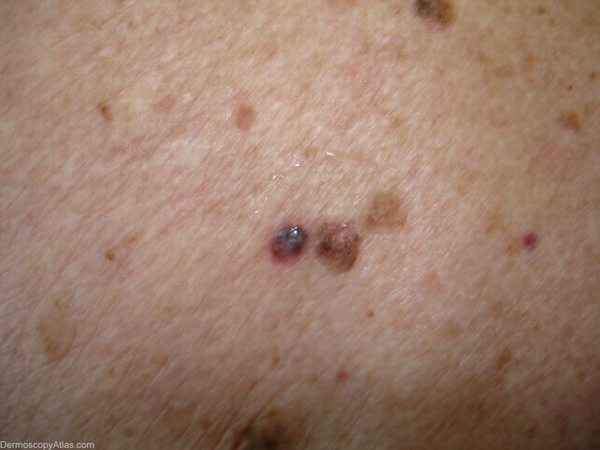 History: This lady had multiple seborrhoeic keratoses on her back but sometimes a lesion sticks out as a bit unusual. This was the juxtaposition of a deeply pigmented BCC and a seborrhoeic keratosis.