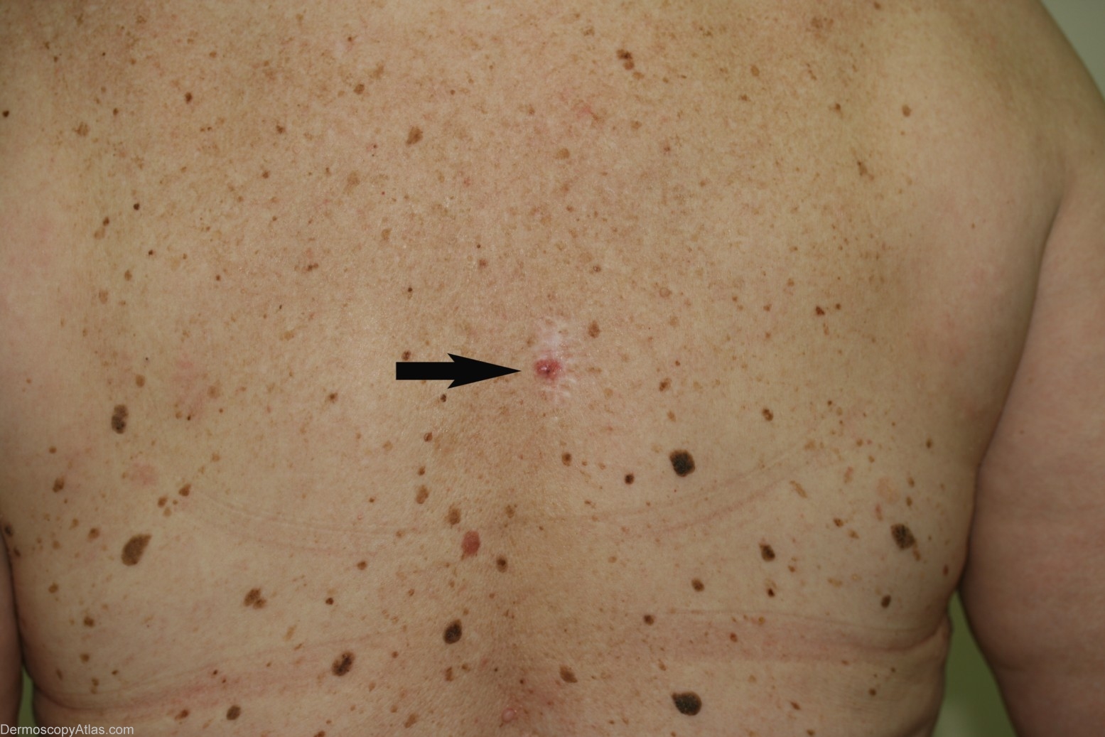 History: This lesion was encountered at a routine skin check on this new patient to the practice. Histology was reported as "...a focally pigmented BCC of solid type expanding the papillary dermis". It was excised with 10mm margins as it was apparently a recurrent BCC arising in continuity with a surgical scar from a BCC excision 5 years earlier.