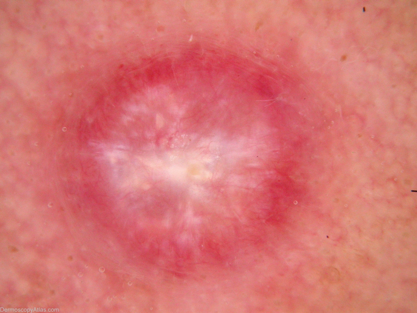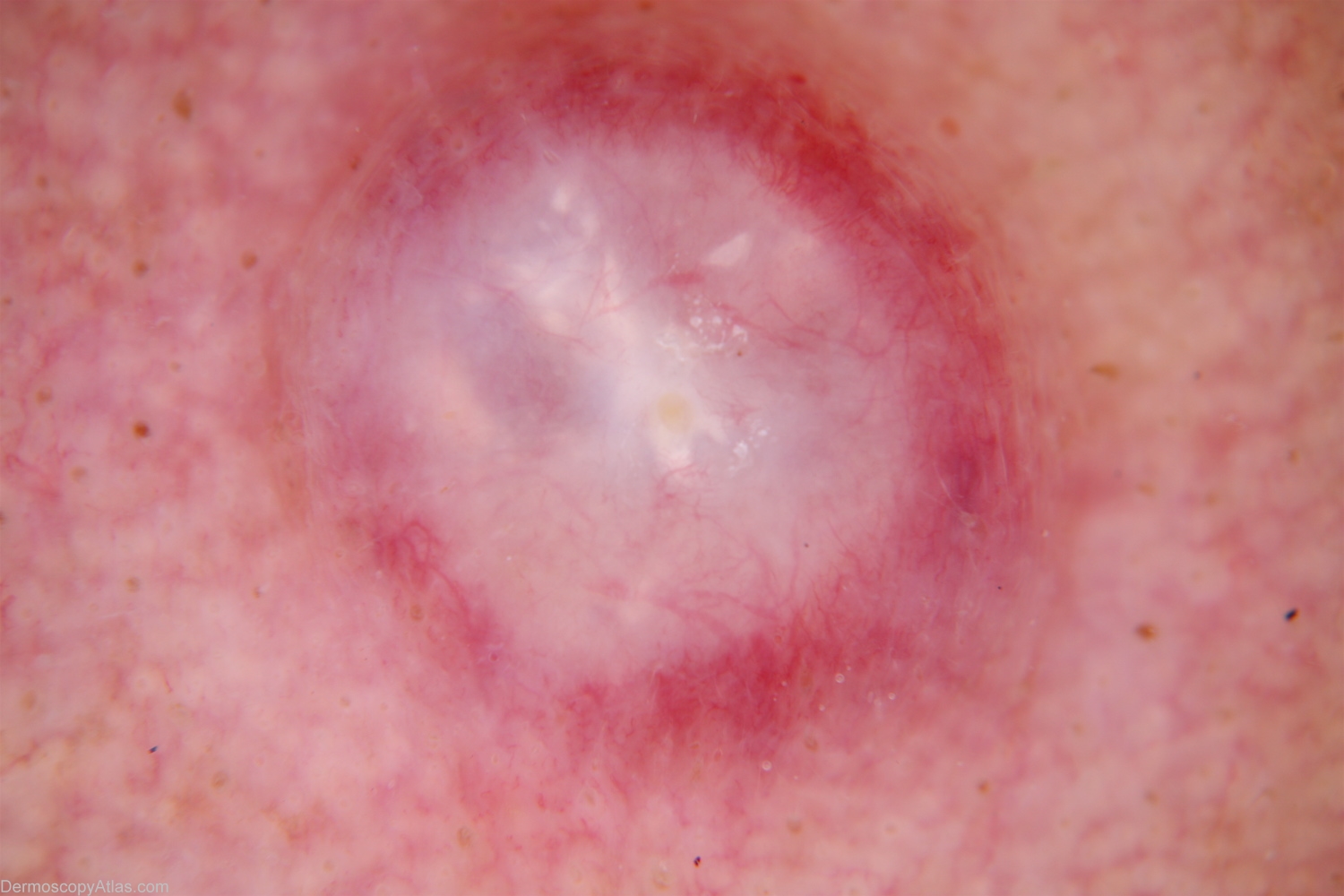 History: Rapidly enlarging preauricular nodule, arising over only 2 weeks. History suggested keratoacanthoma, but histology was reported as Sections show a cystic basal cell carcinoma with matrical differentiation. It extends into deep dermis.