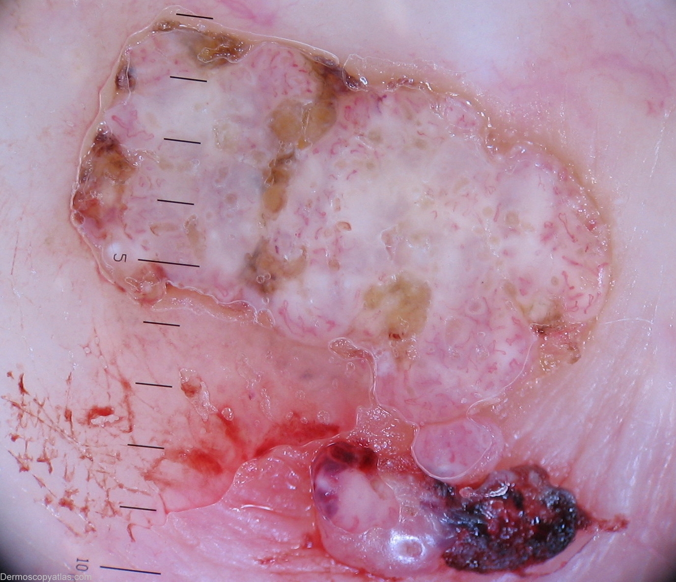 History: Presented with bleeding from the lesion on the right mid clavicle area due to minor trauma with clothing.