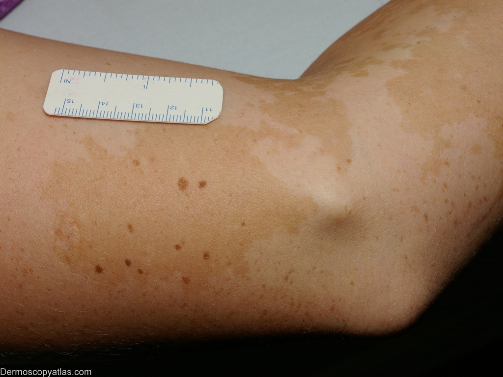 Presented for skin examination with skin phototype I.She was not concerned with her birth mark on her left arm.Images were taken with patient in prone position.