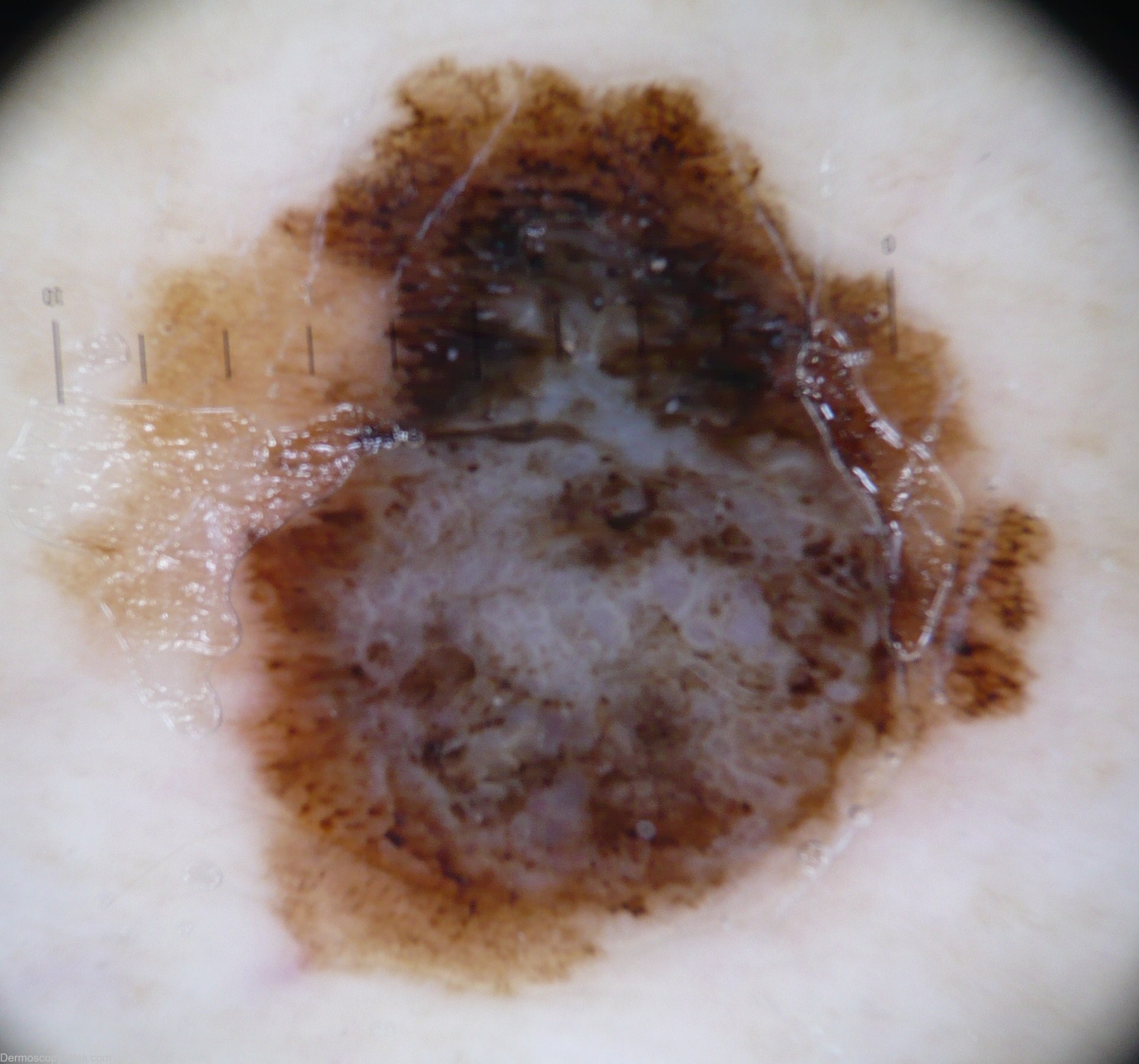 History: This 48 year old lady moved here from the south of Siberia 25 years ago where she had a history of significant sun exposure. She has had NMSC,s This lesion on her lower leg has been changing gradually. She saw a doctor about it a couple of years ago (without dermoscopy) and he reassured her.The pathology showed a melanoma: SSM type,Melanoma level 4 Breslow 1.3mm. Dermoscopic description: Blue-white structures, atypical pigment network, irregular blotches,irregular streaks,regression and some globules in periphery. Case from Siberia.