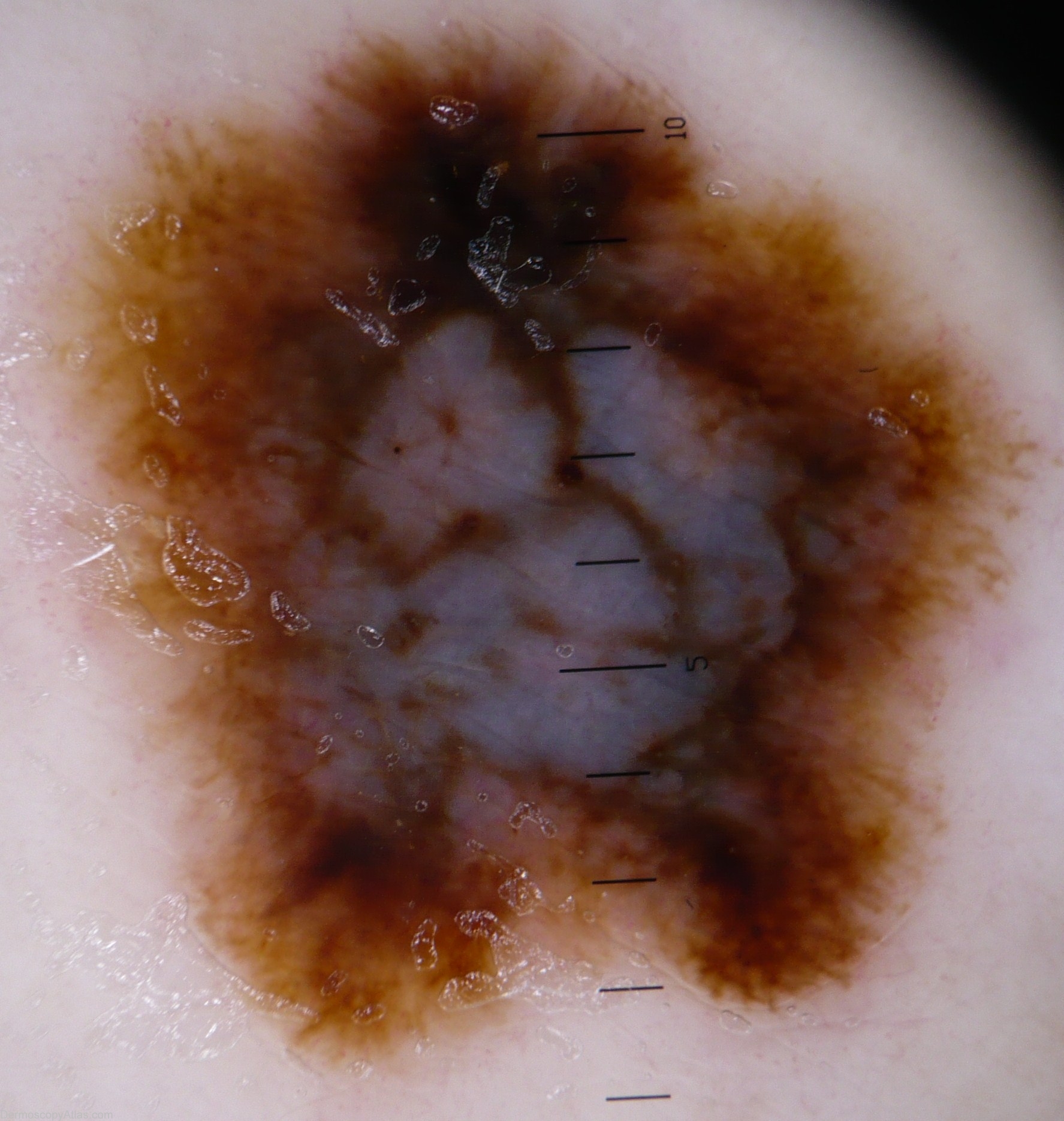 History: This lesion is on the leg of a lady. A pre-existing mole has started to change gradually.The pathology showed a melanoma: SSM type,Melanoma level 3 Breslow 0.6mm Dermoscopic description: Blue-white structures, atypical pigment network, irregular blotches and irregular streaks. Case from Siberia.
