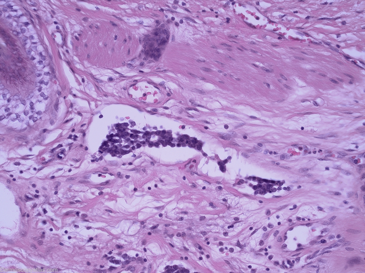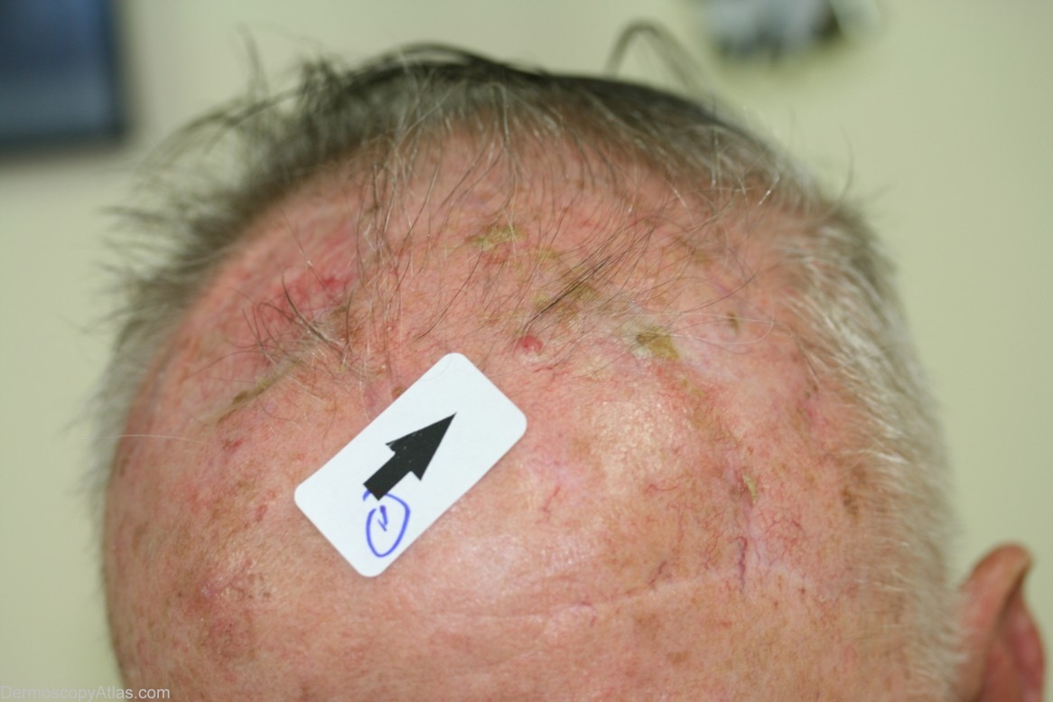 History: This 83 year old gentleman presented for a routine skin check and this lesion was discovered. Prior to biopsy this lesion was lasered without biopsy by another practitioner but subsequent wide excision of the area discovered a residual dermal based Merkel cell carcinoma at the site where this lesion had been.