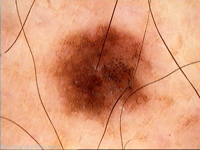 Description: Dermoscopy image Pattern - Clods (neatly aligned in rows consistent with background reticular network)and reticular lines. The clods are central and the reticular network peripheral which gives a measure of symmetry. Colours - Light brown, dark brown and black. Clues - I did wonder whether the clods amounted to thick lines reticular