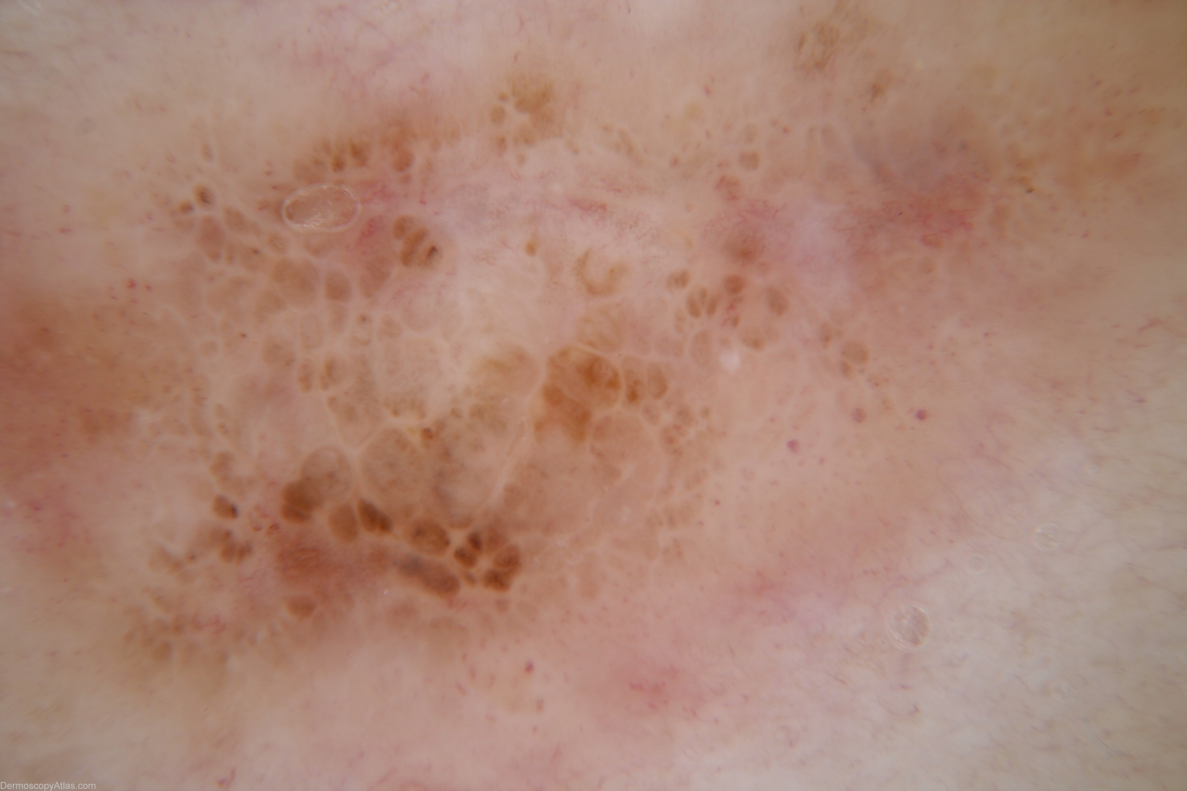 Description: Dermoscopy image Pattern - Clods, arguably white lines reticular, structureless area, structureless area. There is an element of chaotic asymmetry in the arrangement of clods Colours - Light brown, dark brown, red, grey Clues to melanoma - focal grey colour, white lines reticular, dot vessels