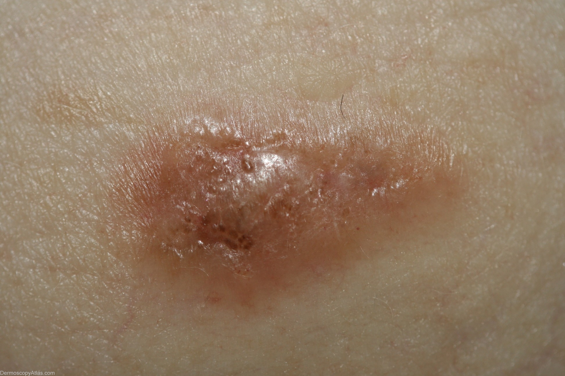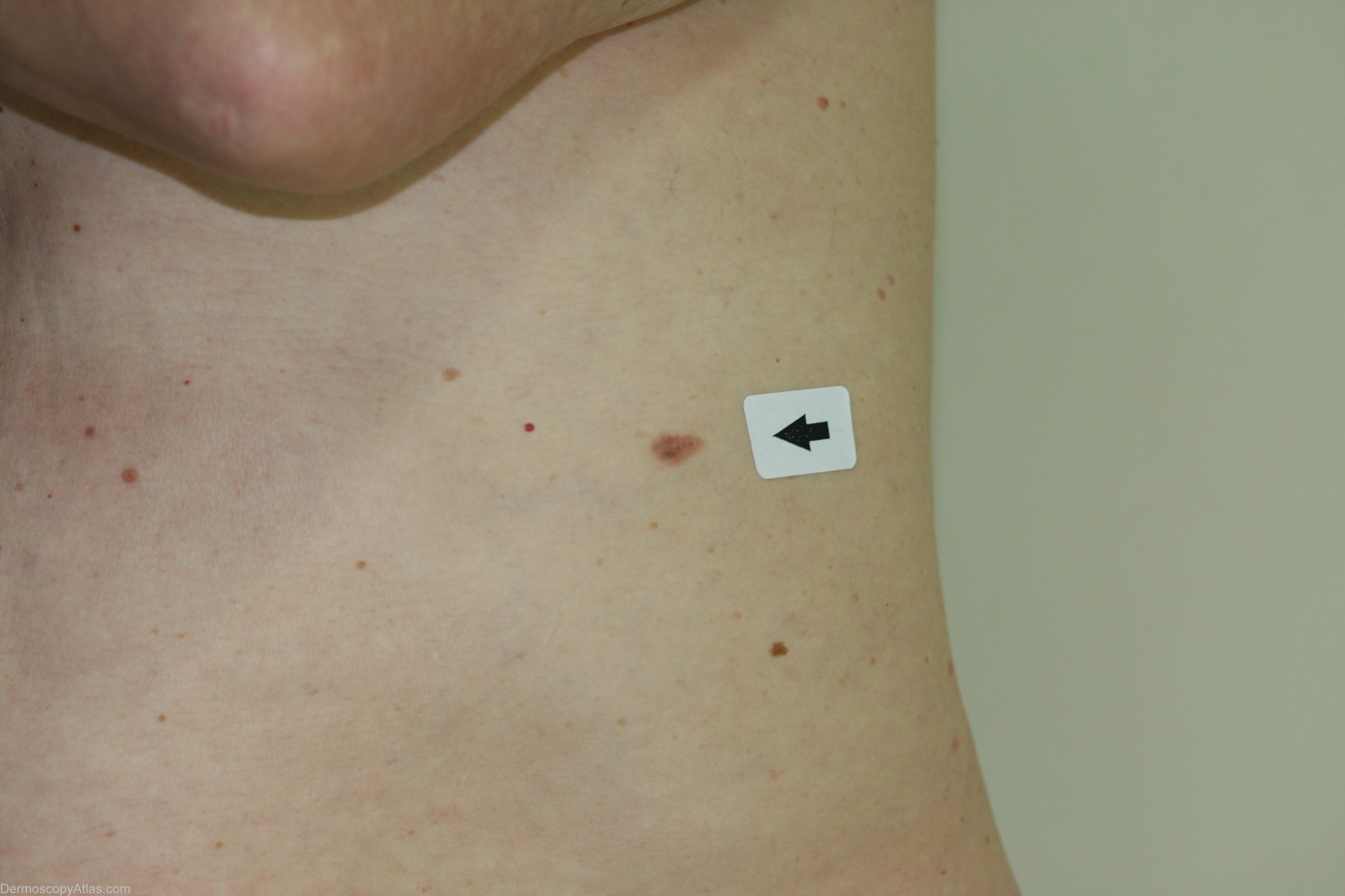 History: This gentleman with no previous history of melanomas presented for a skin examination and this lesion was noticed. I was unsure whether it was melanocytic so performed a punch biopsy. The report stated that it was a benign dysplastic naevus. Because it was melanocytic an excision biopsy was performed which was reported as a level 2 melanoma with a Breslow thickness of 0.7mm. A third procedure was then necessary to achieve appropriate margins.