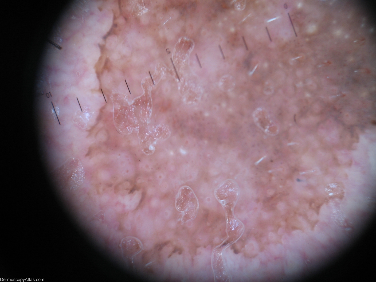 History: Lentigo solar(left part) crossing over with a seborrhoeic keratosis(right part). A 83-year-old man developed an enlarging pigmented patch of his cheek.A biopsy was performed and pathology confirmed the diagnosis of solar lentigo. Dermoscopic description: Right part(seborrhoeic keratosis)- Milia-like cysts,comedo-like openings. Left part(lentigo solar)-sharply demarcated pigmented network and moth-eaten border.