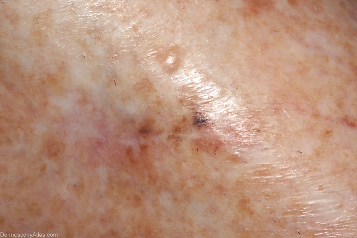 History: This 71 year old lady presented with this macule in continuity with a scar 4 years after excision of a level 4 lentigo maligna melanoma which had been excised with 1.5 mm clearance at the closest margin. The initial exision biopsy of the pigmented macule at the lower end of the scar revealed level 1 lentigo maligna melanoma involving the entirety of both margins. Two further attempts at surgical clearance resulted finally in a level 1 lentigo maligna melanoma with lateral clearance of greater than 10 mm.