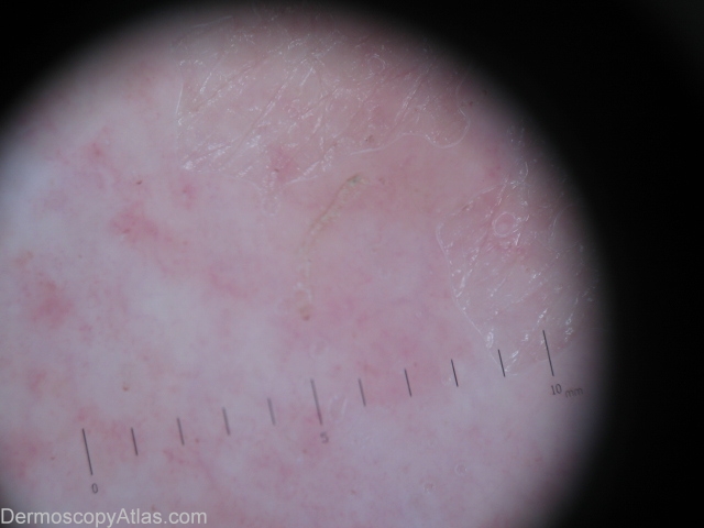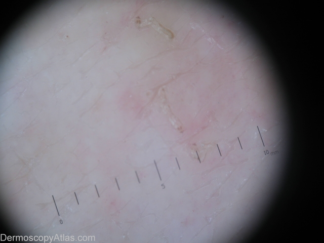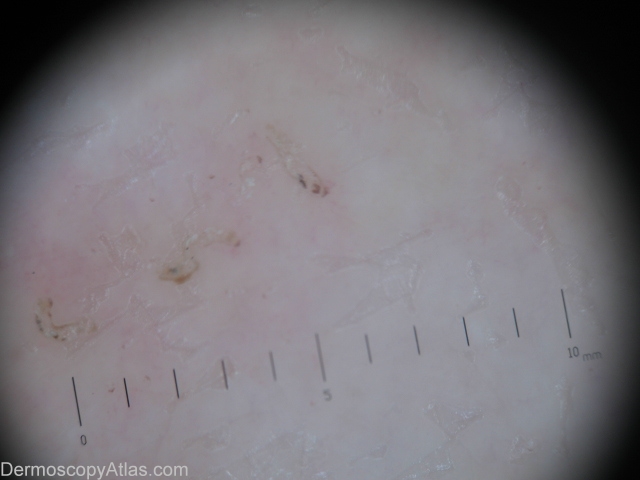 History: This 49 years old woman developed a generalized eruption since 3 years ago. No itching. She take cyclosporin(Neoral) for a long time for some other reasons . She have no itching because she was taken for a long time cyclosporin(Neoral). Dermoscopy in this case is an emerging tool as well. Dermoscopic description:Dermoscopy of scabies exhibits a brown triangle corresponding to the head of the mite, while the body appears translucent.Dermoscopy of the mite with burrow reminds to a jet with contrail.