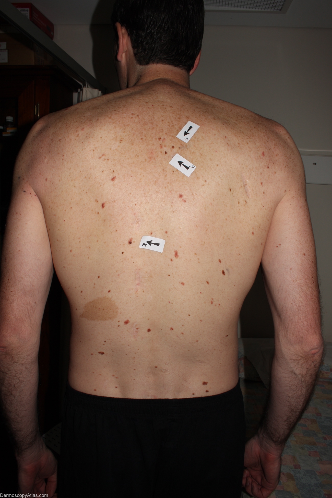 History: 35 year old male with atypical mole syndrome but no past history. Referred by GP regarding this lesion. Melanoma 394 was also found at this examination. Histology reported as; Sections show a level 1 (in situ) superficial spreading melanoma arising in a dysplastic compound naevus. There is no ulceration, dermal invasion, lymphocytic infiltrate or regression.