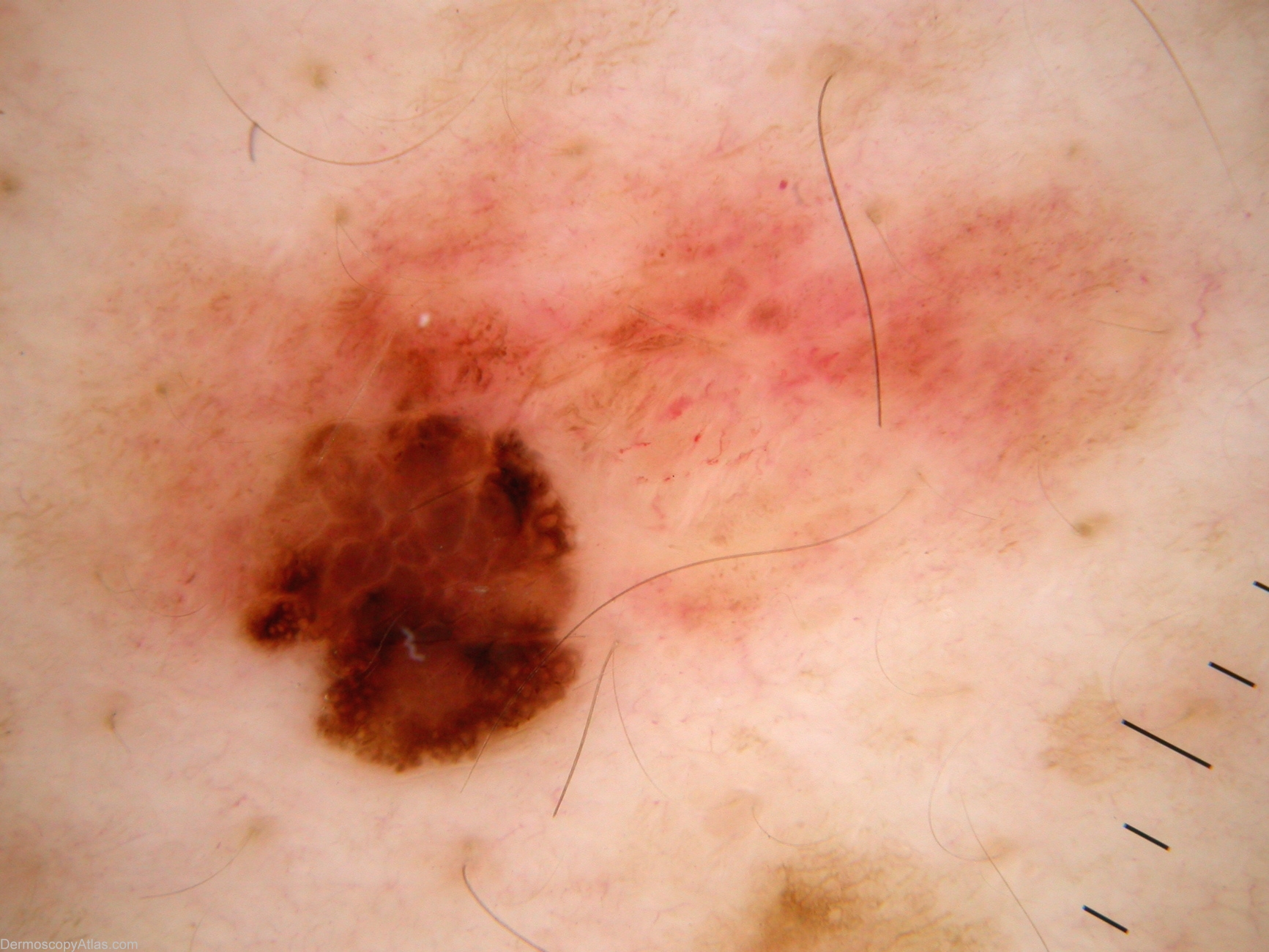 Description: Against the background of structureless tan lesion, a focus of thick lines reticular with irregular black and brown clods, and black dots peripherally (in this focus). Pattern in the superior portion of this focus is brown clods and not white lines reticular (negative network) as the lines are not lighter than surrounding skin.