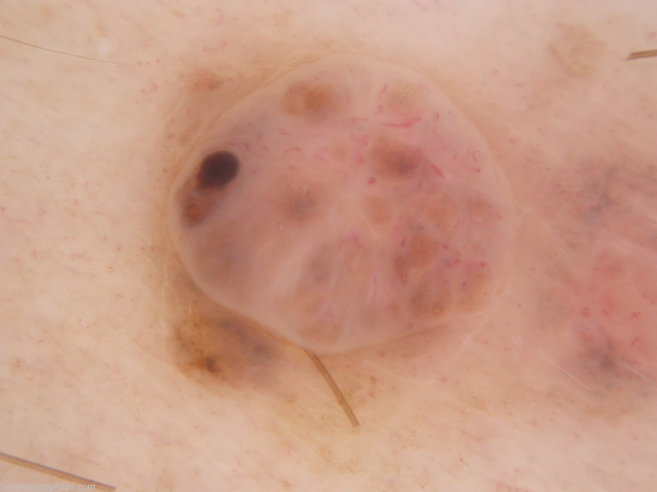 Description: The nodular component is not unlike a benign dermal naevus with maybe (in retrospect) more variability in vessel morphology and the unusual solitary brown clod. The macular component shows dots grey and more unusual fine hairpin vessels. Thes features suggest a (symptomatic) regressing melanocytic lesion.