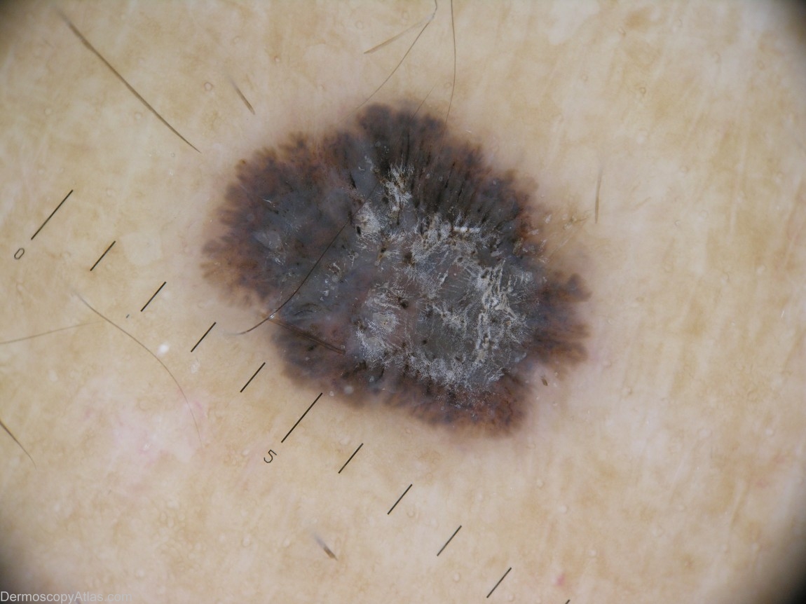 Description: A dark lesion, with a blue-white veil and irregular streaks. At 1 o'clock and 4 o'clock, drafts of grey leaf-like areas are visible.