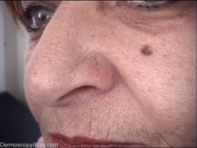 The lady came because she noticed pigmentation on her face of a few years history standing. Dermoscopy exam confirmed a suspicious of basal cell carcinoma and the histology report confirmed it.