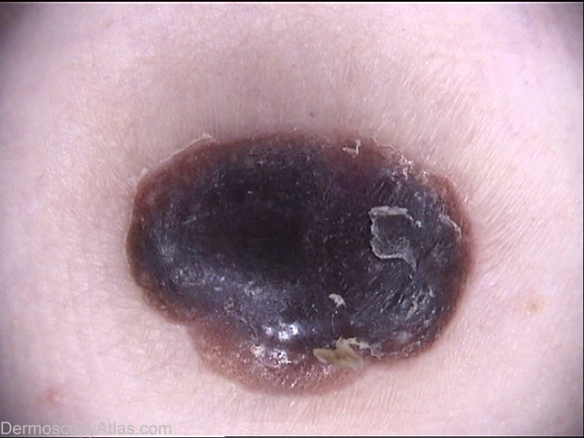 History: The female patient came because she noticed a nodular pigmented lesion a few months ago. Dermoscopy exam and histology report both confirmed the diagnosis of seb. keratosis with an acanthotic and hyperkeratotic epidermis and with horn cysts.
