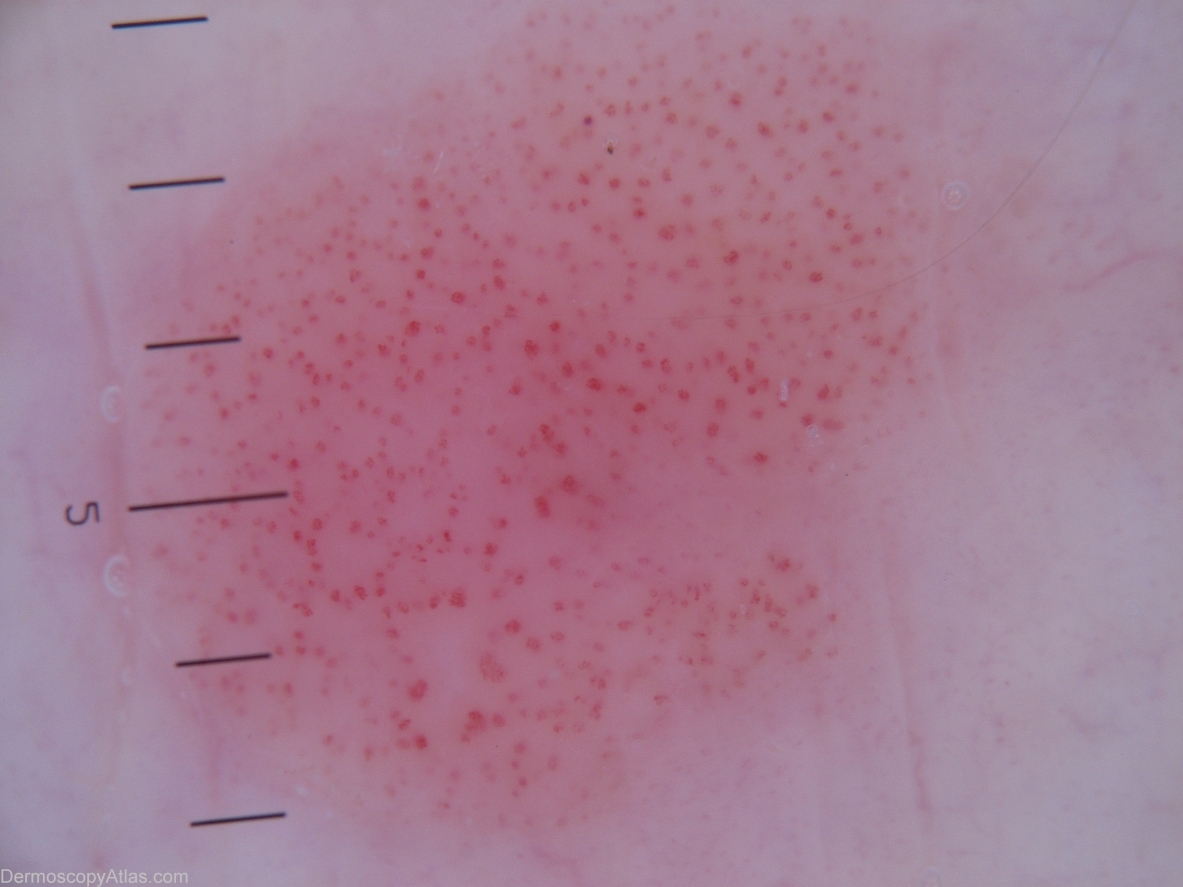 History: Red itchy papule developed over a few weeks. Dermoscopy typical of CCA with dotted vessels arranges in strings of pearls