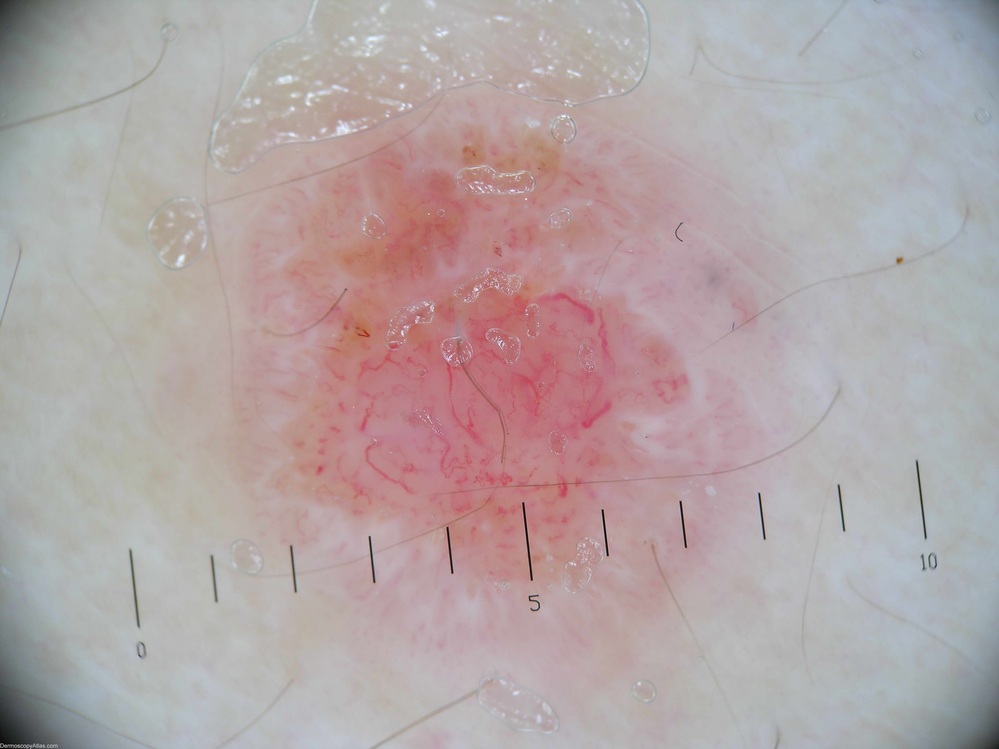 From words of the patient this lesion of skin of the leg has appeared 2 years ago and gradually increased in size. Last year is marked by an itch in a zone around the lesion. The pathology showed an amelanotic melanoma: Breslow 1.75, Clark II The author MD, PhD Dmitry Sokolov