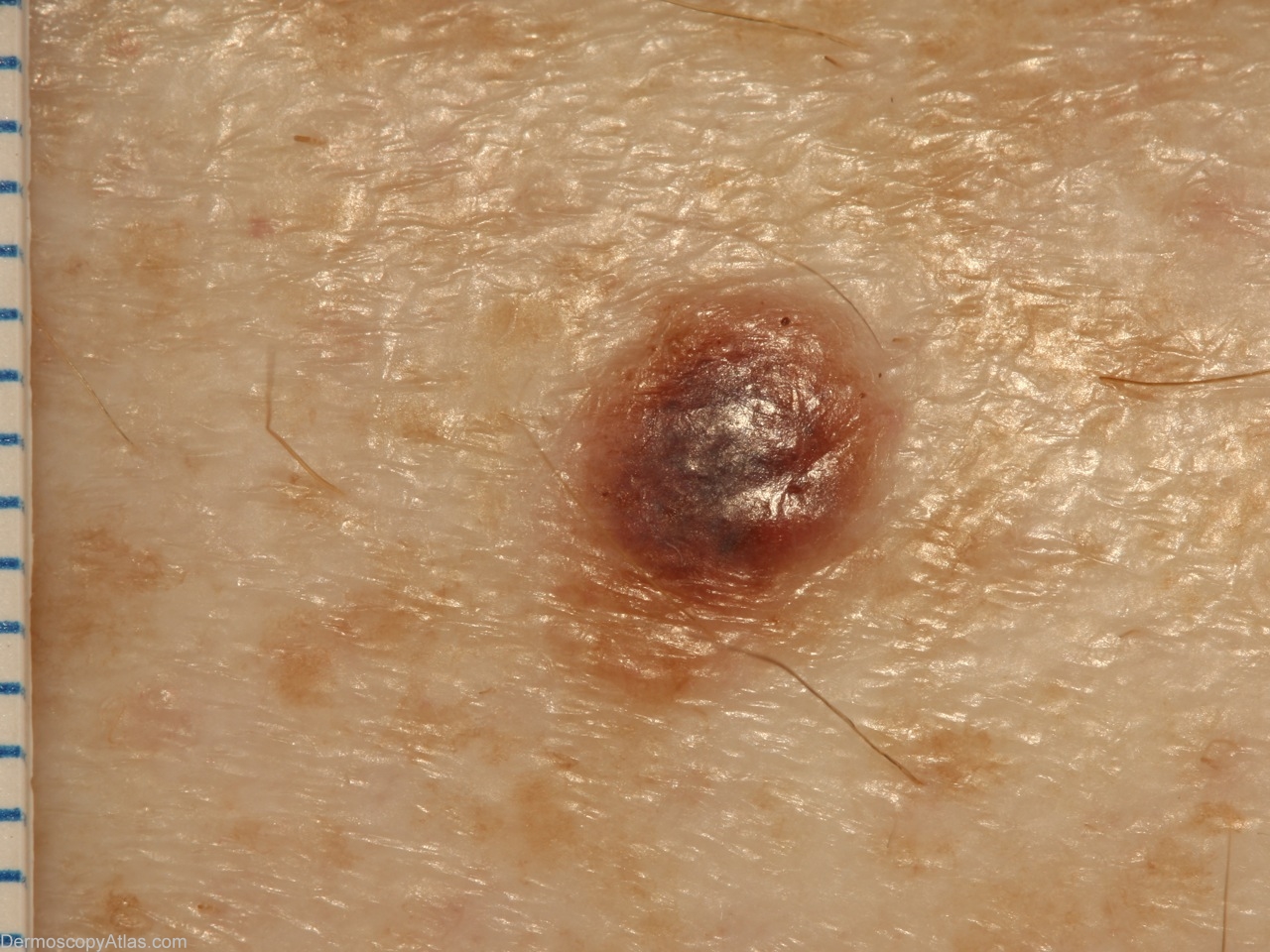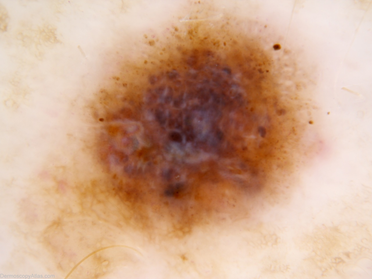 Description: Lines reticular, brown clods and brown dots combine asymmetrically. Brown dots and featureless white as clues to melanoma.