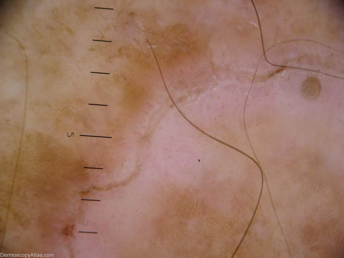 History: This was a solitary porokeratosis on a woman's leg. The dermoscopy shows an excellent peripheral coronoid lamella. Occassionally an SCC in situ can develope in the centre of one of these lesions.