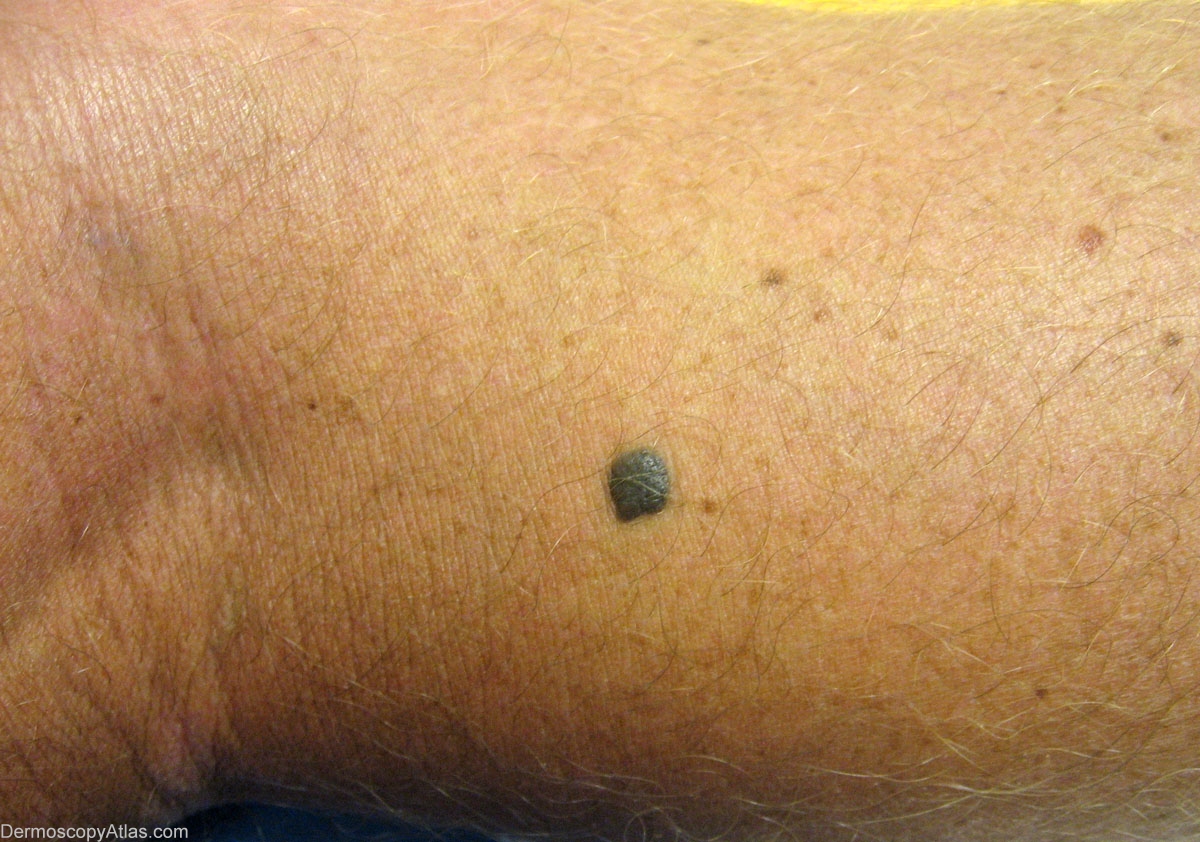 History: This 36 yr old male had a longstanding lesion on the leg without history of change. Dermoscopy show tones of brown as well as the more typical blue, a so called "Brown" Blue Nevus see Chapter III.4 Blue Nevus, Gerardo Ferrara and Giuseppe Argenziano in the Color Atlas of Melanocytic Lesions of the Skin, Springer, 2007