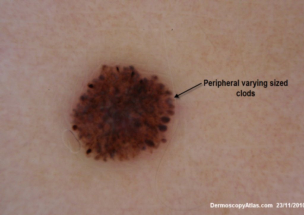 This young lady grew this lesion in a period of 6 months. It was the only pigmented lesion on her skin. There was considerable parental anxiety and monitoring was not thought advisable. The varying sizes of the pweripheral clods was also a worrying factor but they were pretty evenly distributed around the periphery of the lesion which is not the feature of a melanoma.