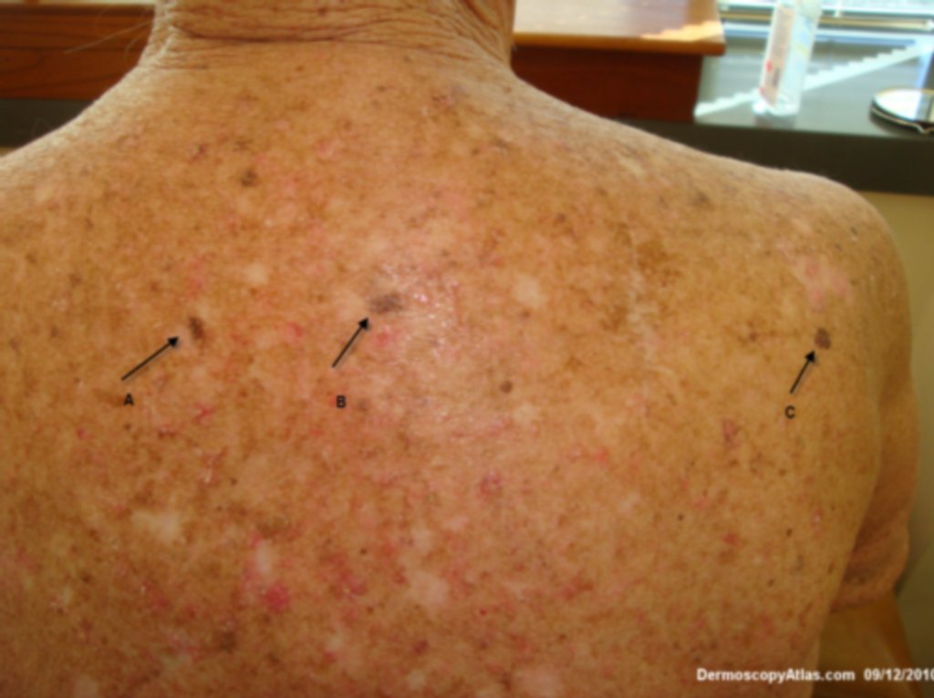 This 93 years old man has severe solar damage with three atypical pigmented lesions on the back. This is the presentation of the labelled lesion C. I thought clinically this would be a melanoma but the histology was best described by the pathologist as dysplastic junctional lentiginous nevus. Other pathologists would describe this as lentiginous melanoma which I would tend to agree with.