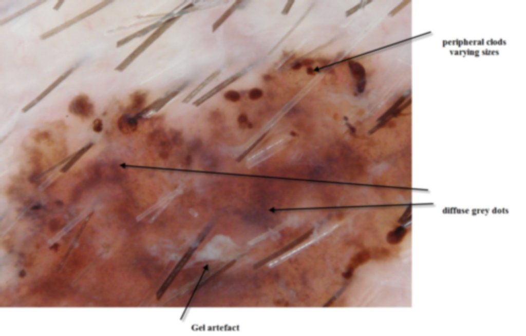 This lesion was noted fotuitously when the patient was having another procedure done on his back. Dermatoscopically it shows peripheral clods of varying sizes, multiple colours and on the enlarged dermatoscopic view some diffuse fine grey dots. It was an invasive melanoma Level 2 , 0.4mm in depth . The histology shows an unusual feature of acantholysis of the tumour nests.
